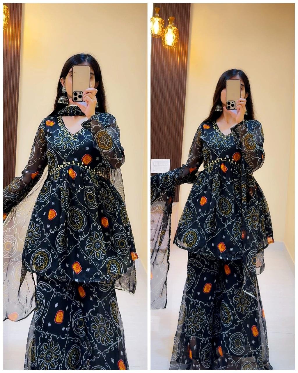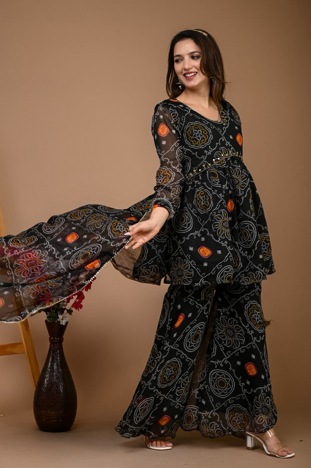 Premium Bandhej Chiffon Sharara Set-BLACK