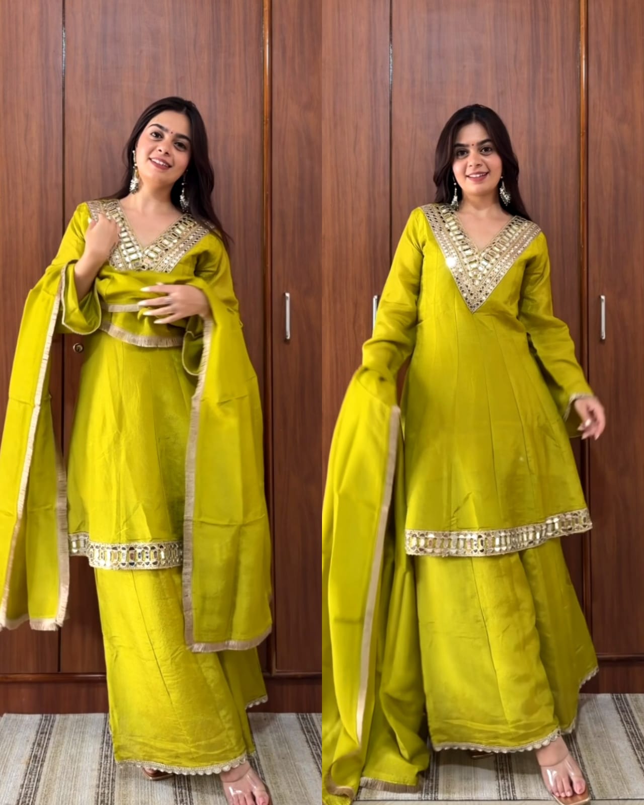 Premium Pure Tissue Mirror work Flared Bottom set -Mehendi Green