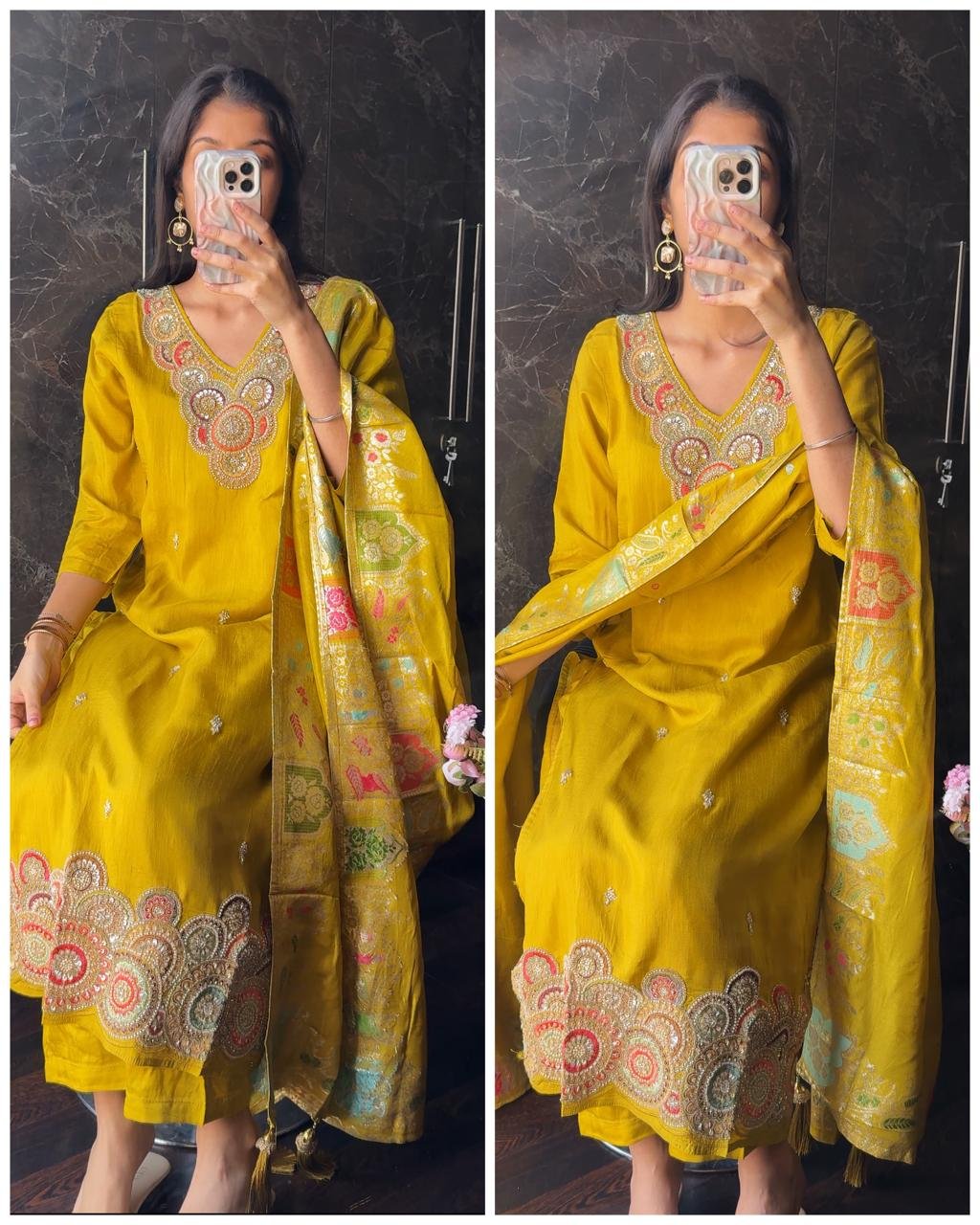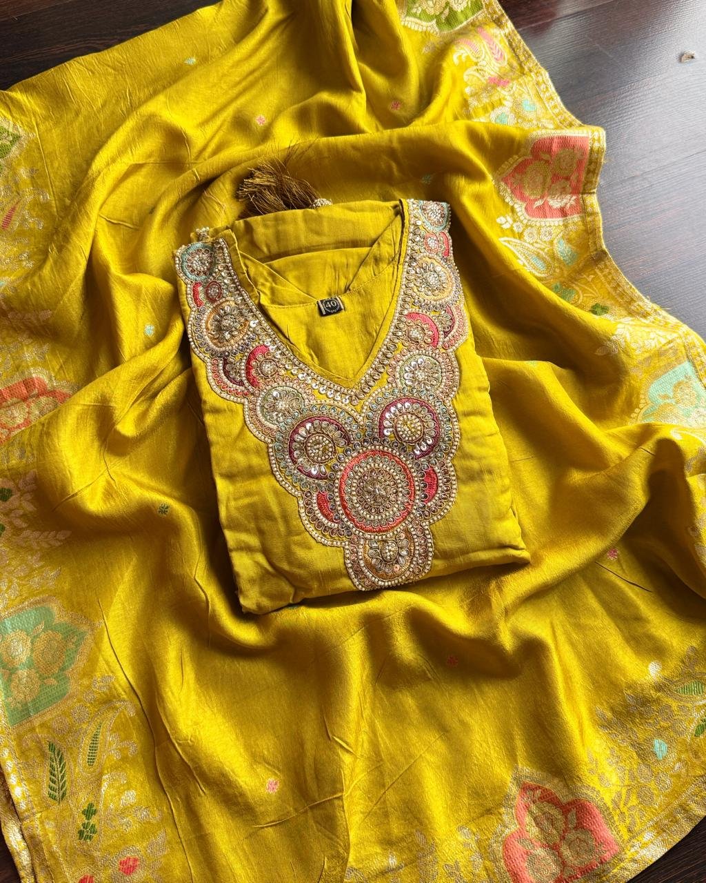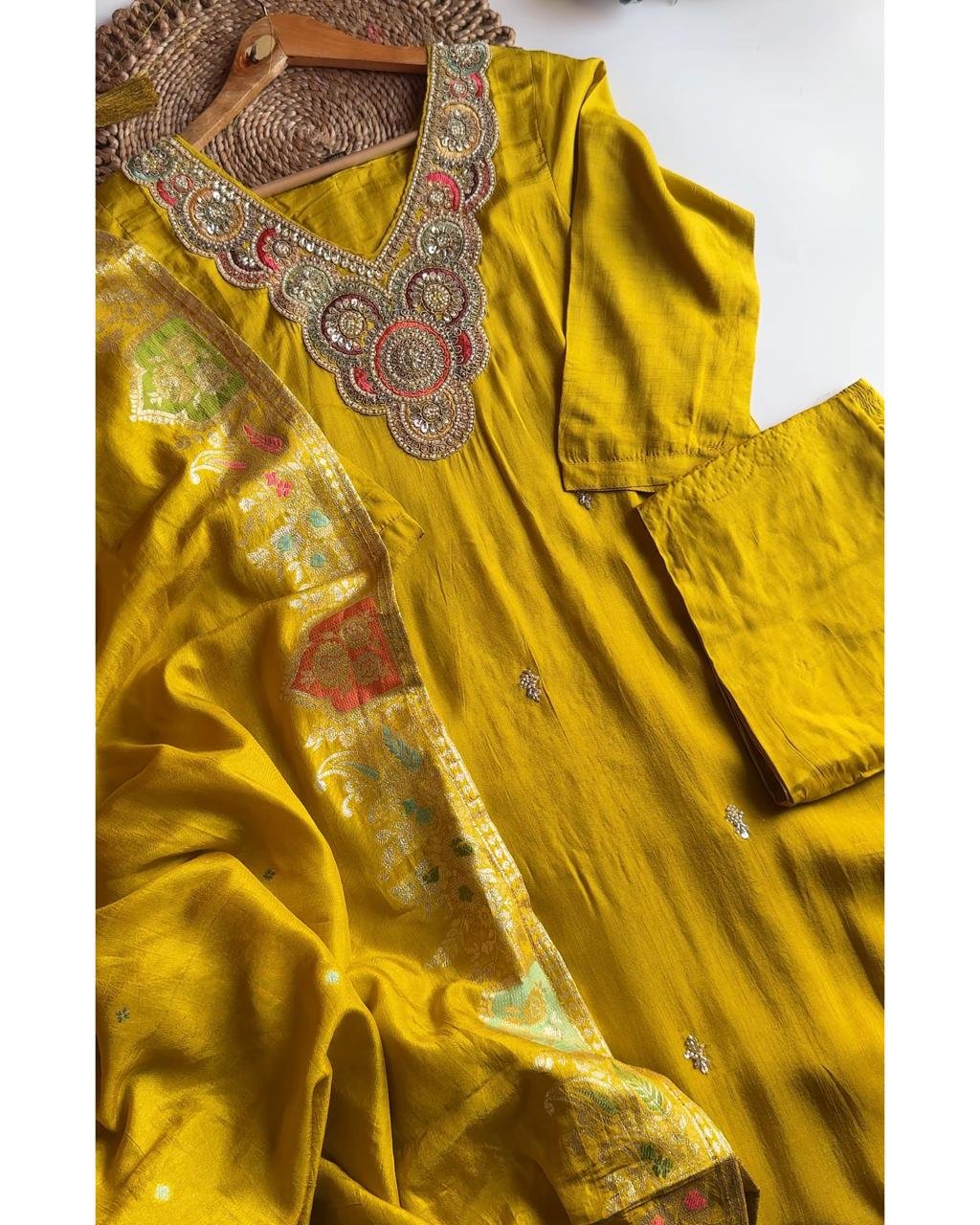 Pure Dola Silk Hand Work Suit – Lime Yellow